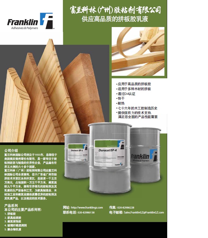 蘭科林國際公司創立于1935年,總部位于美國俄亥俄州哥倫布斯市,是一家專注于膠粘劑研發與制造的世界性企業,產品遍布世界五大洲的六十多個國家。 富蘭科林(廣州)膠粘劑有限公司由富蘭科林國際公司全資擁有,位于廣東省廣州市經濟技術開發區永和開發區,總投資一千五百萬美元,占地面積一萬五千平方米,建筑面積九千平方米。擁有世界領先的膠粘劑生產設備和工藝,為家具制造業、木材加工業和建筑業提供質量優異的膠粘劑產品,以及相應的技術服務。 |